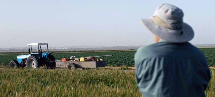 Отец и сын работают в поле по соседству с арабскими деревнями за стеной