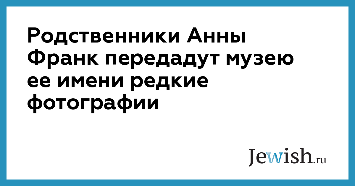 Родственники Анны Франк предоставят коллекцию фотографий и писем музею, посвященному еврейской девочке, дневник которой стал первым документом истории Холокоста, сообщает MIGnews. Дар семьи музею – жест доброй воли по случаю 60-й годовщины со дня первой публикации дневника Анны Франк.