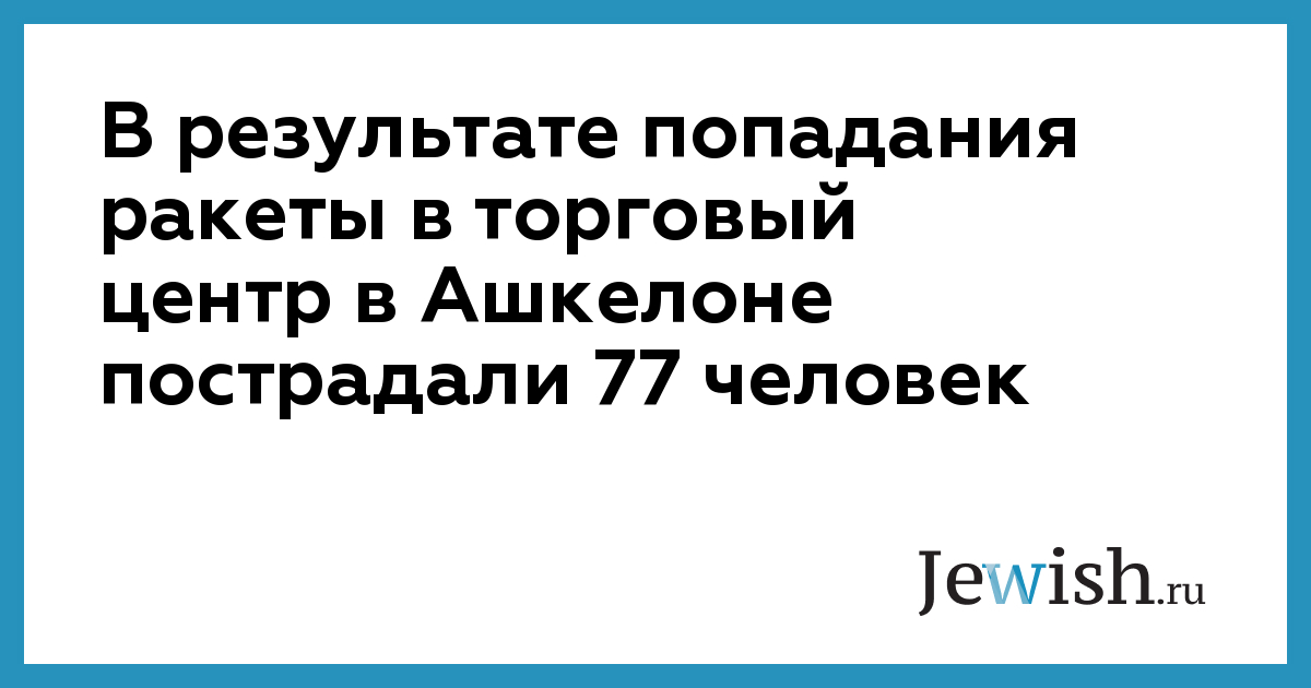 77 израильтян пострадали в результате попадания ракеты "Град" в торговый центр "Шозот хаяцер" в городе Ашкелон. Большое количество людей пострадали от нервного шока. Взрыв произошел на третьем этаже центра, в результате чего обрушилась часть конструкции, и под завалом еще могут быть люди.