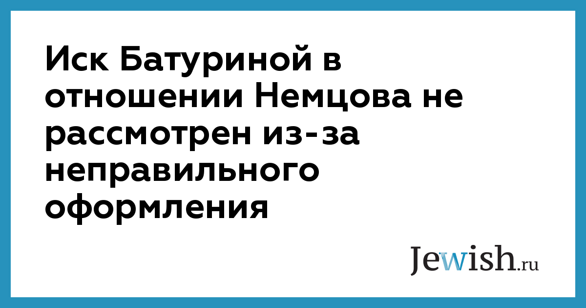 Источник в суде сообщил, что иск супруги мэра Москвы Елены Батуриной и компании "Интеко" в отношении Бориса Немцова о защите чести, достоинства и деловой репутации, а также компенсации морального вреда , поданный в минувшую пятницу в Арбитражный суд Москвы, оставлен без движения. Это связано с неправильным оформлением истцами документов, сообщает Интерфакс.