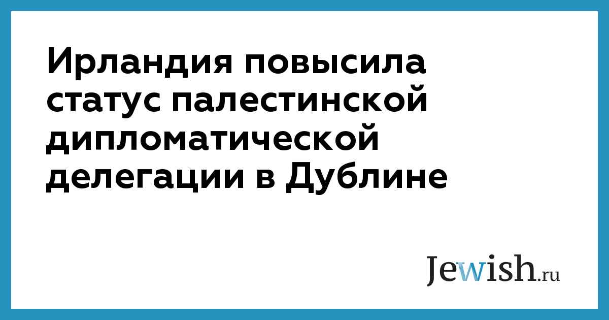 Правительство Ирландии удовлетворило просьбу руководства ПНА и повысило статус палестинской дипломатической делегации в Дублине до уровня миссии. Это предпоследний статус перед статусом посольства, отмечается в официальном заявлении, опубликованном пресс-секретарем ирландского Ирландия повысила статус палестинской дипломатической делегации в Дублине Министерства иностранных дел.