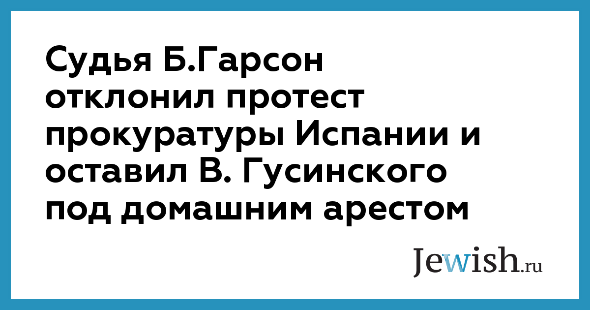 Испанский судья Бальтасар Гарсон решительно отклонил протест Генеральной прокуратуры Испании по делу Владимира Гусинского и оставил в силе свое решение от 22 декабря об освобождении под залог главы холдинга "Медиа-Мост" и содержании его под домашним арестом. Об этом сообщает газета El Pais со ссылкой на представителей испанского правосудия. Судья опроверг все обвинения генпрокурора Эдуардо Фунгаириньо, который назвал решение об освобождении В.Гусинского под залог "предательством по отношению к российским властям" и напомнил в этой связи свою объективность в деле А.Пиночета. Постановление Б.Гарсона уже представлено в прокуратуру Испании, а также передано адвокатам В.Гусинского. Окончательное решение по данному вопросу вынесет Судебная коллегия национального суда Испании. Со своей стороны адвокаты российского предпринимателя намерены представить сегодня документы о признании Тверским межмуниципальным судом Москвы незаконным возбуждение уголовного дела в отношении В.Гусинского. Источники, близкие к испанской прокуратуре, в свою очередь заявили, что после получения документов из Москвы и в случае отказа Генпрокуратуры РФ от продолжения дела экстрадиция В.Гусинского не состоится — он будет выпущен из-под домашнего ареста и ему будет возвращен залог. В настоящее время В.Гусинский содержится под домашним арестом на своей вилле Сотогранде в Кадисе под строгим полицейским надзором: охрана выставлена внутри и снаружи здания, сообщает агентство РБК.