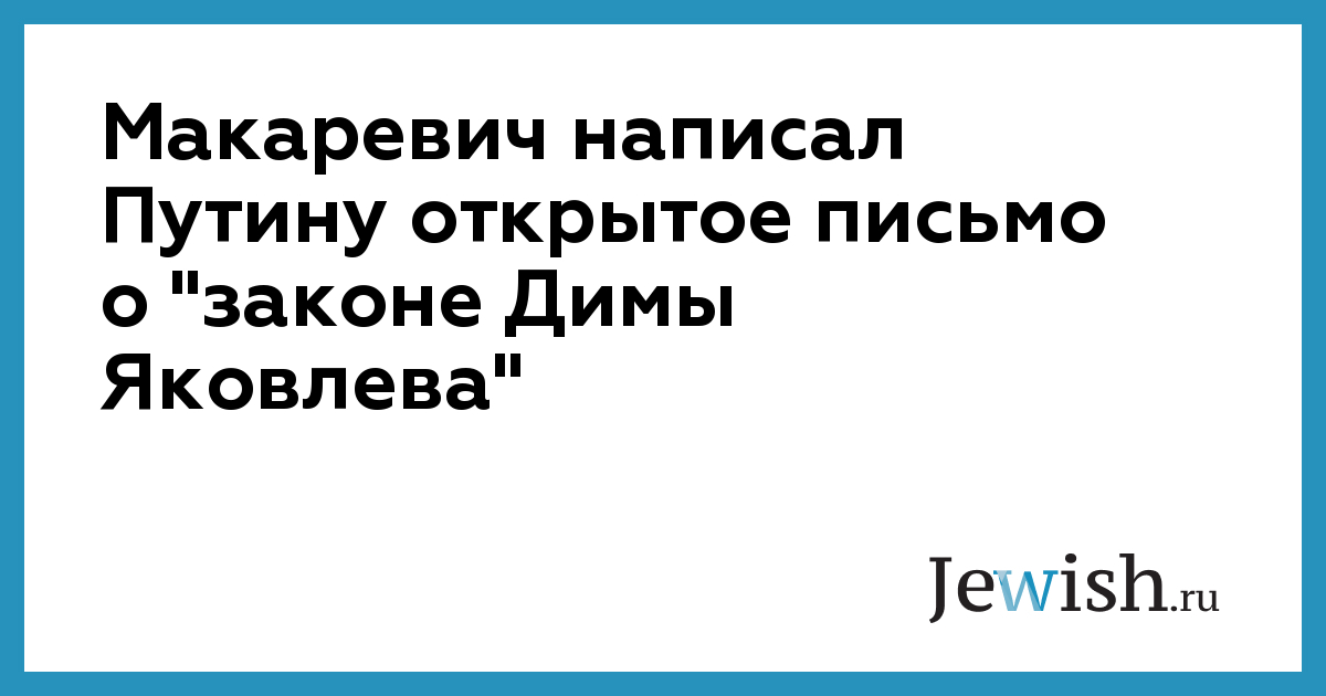 Музыкант Андрей Макаревич написал письмо президенту России Владимиру Путину, где пишет о резонансном "законе Яковлева" и призывает не допустить запрета усыновления российских детей американцами. Письмо опубликовано на сайте газеты "Московский комсомолец".