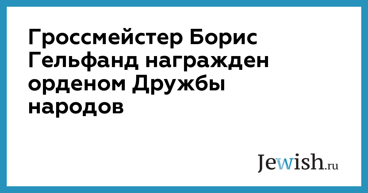Во вторник, 15 июля, в резиденции посла России в Израиле израильскому гроссмейстеру Борису Гельфанду был вручен орден Дружбы народов, сообщает сайт посольства. По заявлению представителя Российской шахматной федерации, гроссмейстер был удостоен одной из высших наград России «за большой вклад в укрепление дружбы и сотрудничества с Российской Федерацией, развитие экономических, научных и культурных связей».