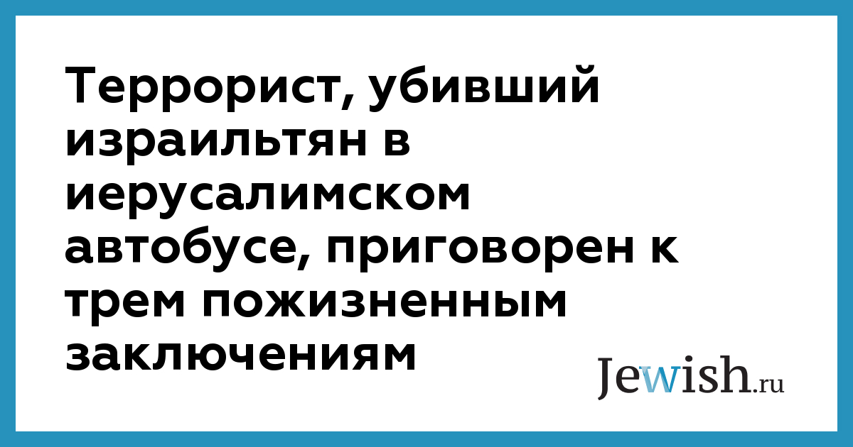 Террорист приговорен к трем пожизненным заключениям и еще к 60 годам тюрьмы. Осужденный также выплатит семьям погибших компенсацию в размере 250 тысяч шекелей, семьям раненых – 150 тысяч, а водителю автобуса 100 тысяч шекелей, сообщает