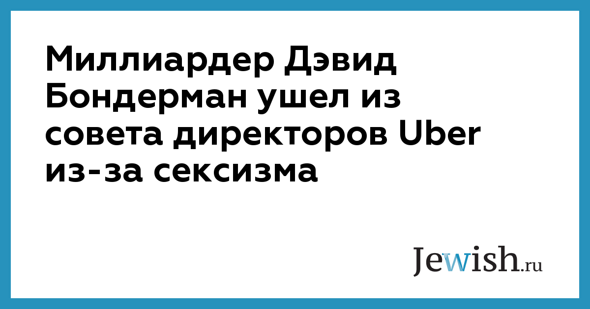 Американский миллиардер еврейского происхождения Дэвид Бондерман, основатель TPG Capital, покинул совет директоров компании Uber. По сообщению The New York Times, решение об уходе было принято после того, как Бондерман сделал сексистский комментарий о женщинах во время встречи сотрудников Uber.