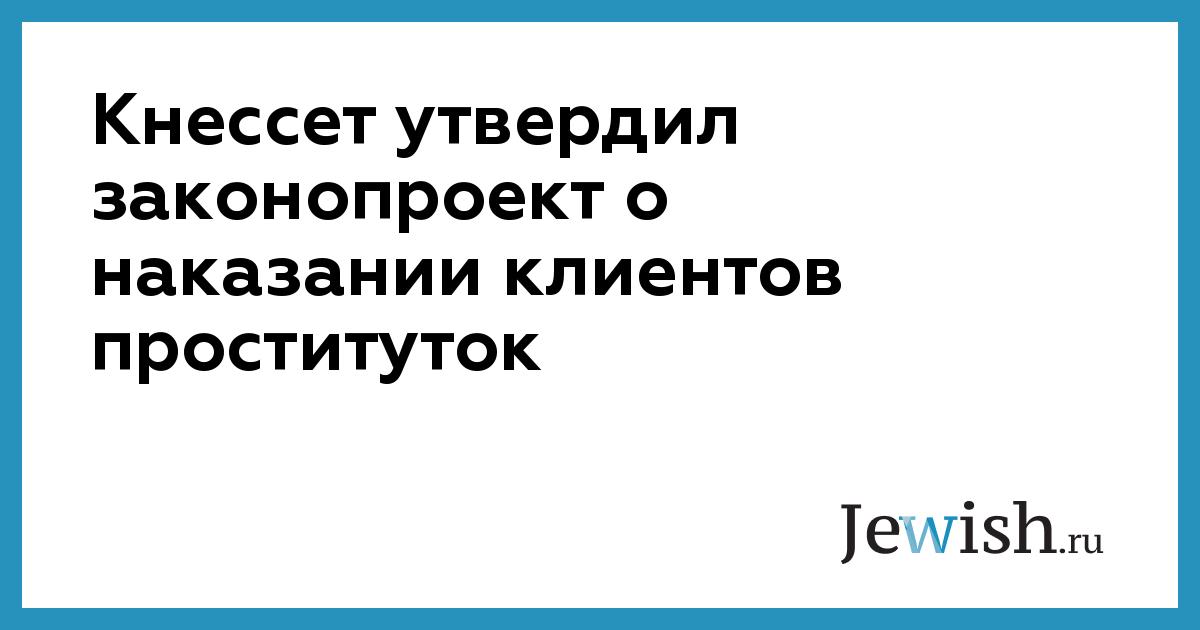 На заседании в среду, 19 июля, Кнессет утвердил в предварительном чтении законопроект о наказании клиентов проституток. В рамках законопроекта предлагается ввести в законодательство вид правонарушение «потребление услуг проституции», и предусмотреть за него наказание вплоть до лишения свободы. Также авторы инициативы предлагают установить ступенчатую шкалу наказаний, которая будет варьироваться от штрафов пойманным клиентам до направления на курсы, где будет объясняться общественный вред проституции. Кроме того, закон подразумевает создание центров помощи проституткам.