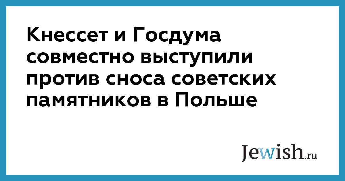 В среду, 19 июля, депутаты Госдумы и Кнессета на пленарных заседаниях осудили снос и осквернение памятников и мемориалов советским солдатам, погибшим в Великой Отечественной войне. «На наших глазах возрастает стремление беспринципных политиков переписать историю и пересмотреть итоги Второй мировой войны. Иначе нельзя расценить, например, закрепление в Республике Польша в рамках "закона о декоммунизации" от 1 апреля 2016 года и недавно принятых Сеймом, Сенатом и подписанных президентом поправок к нему возможности сноса и демонтажа почти 500 памятников и мемориалов, воздвигнутых в честь воинов Красной Армии — освободителей Польши, среди которых были русские, белорусы, украинцы, евреи, азербайджанцы, казахи, армяне, киргизы и другие представители советского народа — победителя», — заявили в Госдуме.