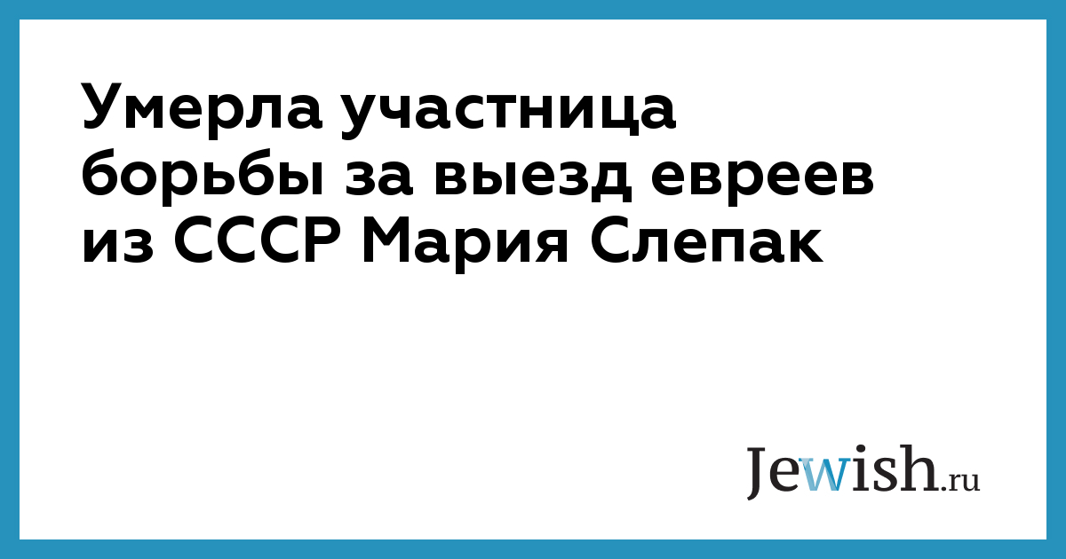 Умерла Мария Слепак — ветеран борьбы за освобождение евреев СССР, жена известного отказника и правозащитника Владимира Слепака. О ее смерти сообщил глава «Сохнута» Натан Щаранский. «Почти 20 лет Володя и Мария были, без всякого преувеличения, безусловными лидерами исторического движения по физическому и духовному освобождению советских евреев… Их маленькая коммунальная квартира в Москве была настоящим центром нашего движения в 1970-е и 1980-е, принимая тысячи евреев со всего СССР, иностранных туристов и западных журналистов. У Марии были душевные и физические силы не только принять и накормить каждого, но даже в самых тяжелых обстоятельствах поддержать друзей добрым словом, разговором и шуткой — даже во времена слез».