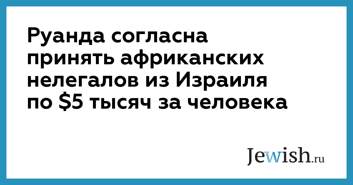 Власти Руанды заявили о готовности принять около 10 тысяч нелегальных мигрантов из Африки, находящихся сейчас на территории Израиля. Заявление министра иностранных дел Руанды последовало после нашумевшего предложения Израиля платить Руанде по $5 тысяч за каждого нелегального беженца из Африки, который находится на территории Израиля. Кроме того, Тель-Авив готов заплатить каждому беженцу по $3,5 тысячи, если они добровольно согласятся покинуть территорию Израиля и уехать в Руанду. Об этом пишет Коммерсант .