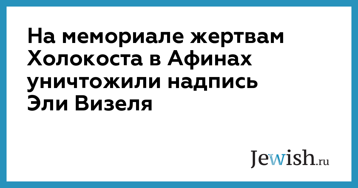 Вандалы уничтожили часть надписи, сделанной бывшим узником концлагерей, писателем, нобелевским лауреатом Эли Визелем на мемориале жертвам Холокоста в Афинах. Акт вандализма был совершен в субботу, 2 декабря, пишет JTA. С гравированной таблички были «стерты» надписи на греческом и французском, осталась только фраза на английском.
