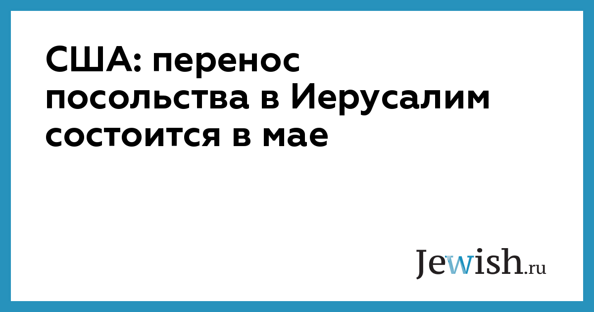 Чиновник ответил на сообщение в Твиттере министра транспорта Израиля Каца, утверждавшего, что переезд произойдет весной. «Мы планируем открыть новое посольство США в Израиле в Иерусалиме в мае», – сказал официальный представитель США. «Открытие посольства будет приурочено к 70-летию Израиля». «Посольство первоначально будет расположено в Арноне, на территории, где в настоящее время находятся консульские учреждения иерусалимского Генерального консульства», – продолжил он.