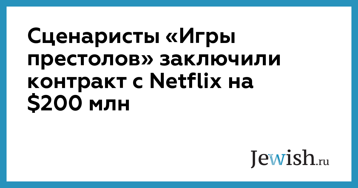 Сценаристы сериала «Игра престолов» Дэвид Бениофф и Дэниел Вайс заключили долгосрочный контракт с Netflix на сумму в 200 млн долларов. Бывшие сценаристы HBO займутся работой над фильмами и телешоу для стримингового сервиса. За контракт с тандемом Бениофф-Вайс боролись Netflix, The Walt Disney Company и Amazon, сообщает The Hollywood Reporter.