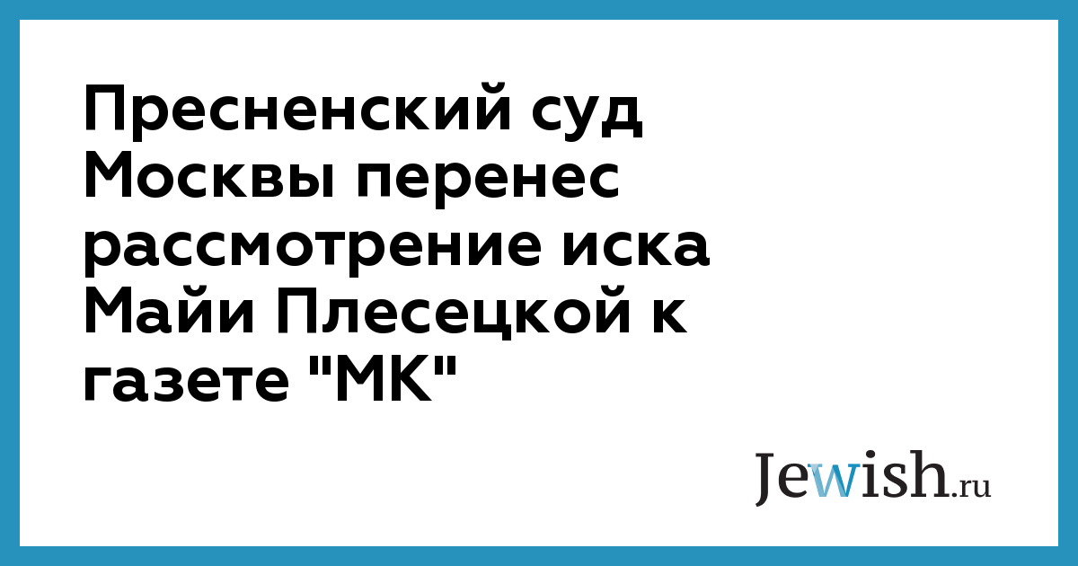 Пресненский муниципальный суд Москвы сегодня перенес на 10 июля рассмотрение иска о защите чести, достоинства и деловой репутации Майи Плесецкой к газете "Московский комсомолец". Причиной переноса послужило заявленное ходатайство адвоката истицы Бориса Кузнецова о привлечении к процессу народных заседателей. Перед заседанием суда Кузнецов заявил, что его клиентка никогда не имела детей, и это подтверждается медицинским заключением. Кроме того, 3 сентября 1976г., когда родилась Юлия Глаговская, Майя Плесецкая находилась на гастролях в Австралии. По словам Б.Кухзнецова, все домыслы относительно дочери Плесецкой "вводят ее в тяжелое моральное состояние, поскольку речь идет о рождении ребенка вне брака". Сама Ю.Глаговская также заявила сегодня журналистам перед заседанием суда, что "не преследует цели публично опозорить Плесецкую". По ее словам, она готова "идти на компромисс, если балерина признает их родство". В противном случае она намерена подать иск о материнстве в Тверской суд Москвы. Проводом для подачи иска стала статья, опубликованная в "МК" под названием "Здравствуйте, я — дочь Майи Плесецкой". В ней говорится, о Юлии Глаговской, которая проживает в Израиле и утверждает, что является дочерью балерины. В исковом заявлении М.Плесецкая требует возмещения морального вреда в размере 150 тыс. долл.