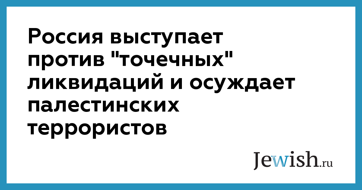 "Россия выступает против "точечных" ликвидаций экстремистов, практики внесудебных расправ и непропорционального применения силы в густонаселенных районах", — сказал российский дипломат. При этом она осуждает терроризм "во всех его формах и проявлениях" и призывает Палестинскую национальную администрацию принять решительные меры по обузданию террористов, чтобы исключить нападения на мирное израильское население.