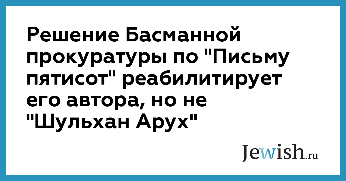 Решение Басманной прокуратуры по "Письму пятисот" реабилитирует его автора, но не "Шульхан Арух"