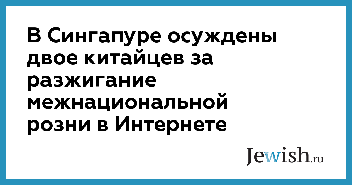 Суд в Сингапуре в пятницу признал виновными двух местных жителей — этнических китайцев — в разжигании межнациональной розни в интернет-конференциях. 27-летний сотрудник приюта для бездомных животных Бенджамин Ко Сон Хуат (Benjamin Koh Song Huat) был приговорен к месяцу тюрьмы, а 25-летний безработный Николас Лим Ю (Nicholas Lim Yew) был оштрафован на 5 тысяч сингапурских долларов (около 2900 долларо США) и приговорен к одному дню тюрьмы — приговоры вынесены на основании оставленных ими записей, направленных против этнических малайцев, сообщает агентство Associated Press.