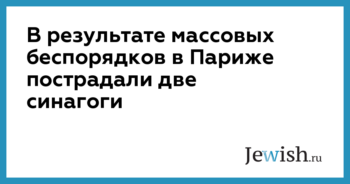 В результате массовых беспорядков в пригородах Парижа пострадали две синагоги. В конце прошлой недели, бутылка с горючей смесью была брошена в дверь одной из синагог еврейской общины Ранси. В ночь с пятницы на субботу возле другой синагоги сдетонировало подобное устройство.