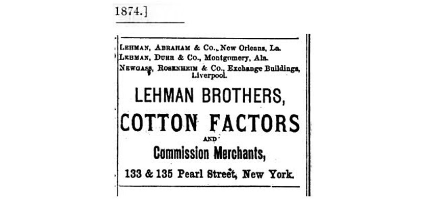 Банк Lehman Brothers был создан тремя еврейскими братьями. Старший из них, Хаим (Генрих) Леман, вступил на американскую землю в 1844-м. Тогда в поисках лучшей жизни он покинул отчий дом, находившийся в баварском городке Вюрцбург. Ждать от него вестей на землях Германского союза остались два младших брата – Эммануэль и Майер, – помогавших отцу вести его хозяйство по разведению скота. Хаим же, адаптируясь к новой среде, изменил свое германское имя Генрих на Генри и открыл небольшую лавку в городе Мобил штата Алабама. Штат, как известно, славился своими поставками «белого золота», или попросту – хлопка. Вот Генри и решил продавать в своем магазине все, что может пригодиться как плантаторам, так и их рабочим.