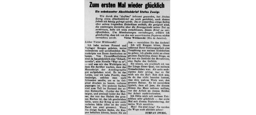 В конце октября 1941 года на имя Виттковского пришло небольшое послание от Цвейга: «Наш мир разрушен, но главный ужас наступит после войны. Чудовищный уровень ненависти в европейских странах: класс против класса, человек против человека…» Письмо стало предвестником будущей трагедии: 22 февраля 1942 года австрийский писатель, измученный изгнанием и ужасающими новостями из Европы, покончил с собой. На следующее утро в спальне на прикроватной тумбочке рядом с телом Цвейга полиция нашла много прощальных писем и распоряжений: на немецком, английском, испанском, португальском языках. Среди них находилось и послание для Витковского.