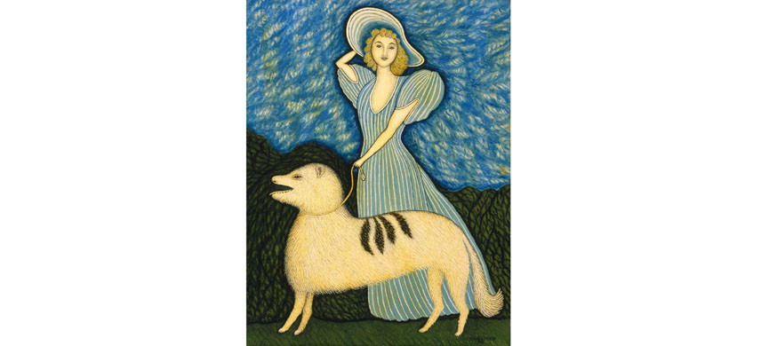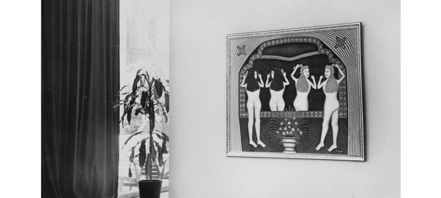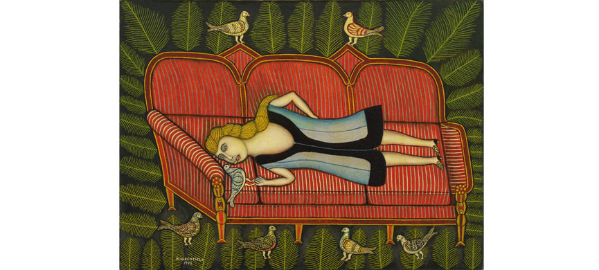 Хиршфилд говорил, что вдохновлялся классическим «музейным» искусством – и пытался рисовать так же. Но отсутствие знаний привело к неожиданному результату. Из-под его пера вышло причудливое примитивистское полотно – изображение женщины, лежащей на диване. Диван и обои художник украсил орнаментом, добавил птичек. Получилось ярко, нелепо, наивно – и безумно красиво.