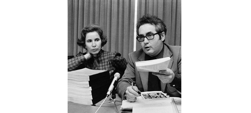 <p>Beate et Serge Klarsfeld viennent perturber les obsèques de Xavier Vallat, ancien commissaire général aux questions juives et figure de l’extrême-droite antisémite, à Pailharès. 8 janvier 1972 Photo Elie Kagan/BDIC</p>