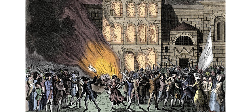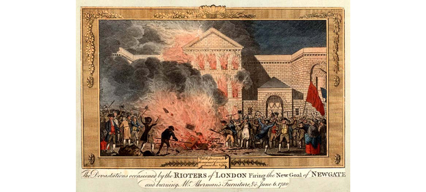 В 1778 году британский парламент принял Акт о папистах, существенно расширявший права католиков. Главное, им позволялось служить в британской армии. Лорд Гордон стал выступать против акта, в связи с чем снискал себе определенную известность – вскоре его избрали главой Протестантской ассоциации. Когда 2 июня 1780 года он понес в парламент петицию с требованием отмены «папского закона», его решили сопроводить до Вестминстера 60 тысяч человек. Шествие закончилось беспорядками – наиболее буйные сторонники лорда ворвались в Палату общин и отказывались ее покидать. Ситуация быстро вышла из-под контроля – Лондон захлестнули волнения, продолжавшиеся шесть дней. Протестантская ассоциация призвала своих членов воздержаться от насилия, но было поздно – толпа открыла ворота тюрем и разграбила множество частных домов. В итоге число убитых превысило 300 человек, мятежники даже попытались штурмовать Банк Англии, пока их не остановили выстрелы мушкетов. Утром 9 июня Лондон выглядел, как поле битвы. Тогда же лорда Гордона арестовали по обвинению в государственной измене и заключили в Тауэр.