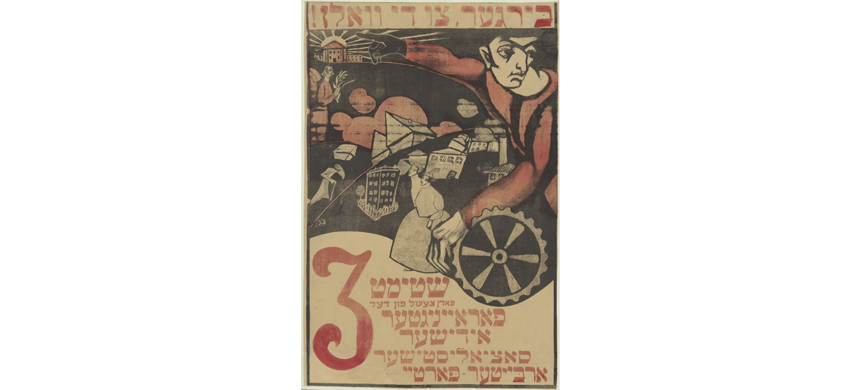 Половина рисунка отдана молодому еврейскому рабочему: левой рукой он крутит шестеренку, перстом правой указывает в залитое солнцем светлое будущее. Для кого оно? Вот, для изображенных рядом евреев – и для старых, из местечек, и для молодых, уже перебравшихся в город. Дальше следует минималистичная надпись в духе современных выборов: «Объединенная еврейская социалистическая рабочая партия, бюллетень номер 3».