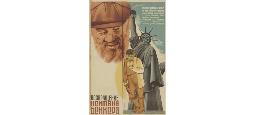 Интересно, что один из первых звуковых советских фильмов был снят в 1932 году киностудией «Белгоскино» на еврейскую тему. И это единственный советский фильм, выпущенный одновременно на русском и идише. Одним из сценаристов был Перец Маркиш, единственный из идишских писателей кавалер ордена Ленина. Фабула фильма «Возвращение Нейтана Беккера» такова: каменщик Натан (Давид Гутман) вернулся после 28-летней эмиграции, потому что в Америке случилась Великая депрессия. Он привез с собой жену и друга, негра Джима, и вместе с другими евреями своего штетла получил работу на Магнитке. Там он вступил в конфликт с руководителем-коммунистом, которого играет «Чапаев всех времен и народов» Борис Бабочкин, и перевоспитался. Фильм полон прекрасной натуры штетла, которая снималась в Виннице, и народных песен на идише. На афише – сам Натан, Михоэлс в роли Цале, отца Натана, и статуя Свободы с черепом вместо лица.