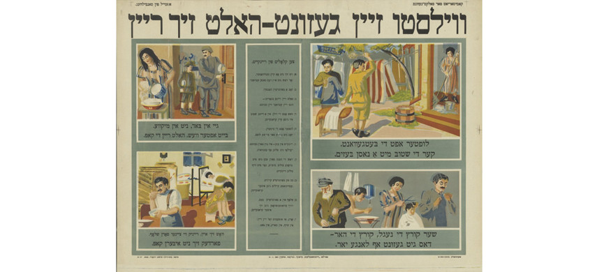 В Киеве в рамках санитарно-просветительской кампании под эгидой Народного комиссариата здравоохранения СССР тоже был выпущен агитационный плакат для евреев. Надпись на идише крупными буквами: «Хочешь быть здоровым – поддерживай чистоту». На этом плакате сотрудники еврейского издательства «Висеншафтлехе геданк» («Научная мысль») попытались эзоповым языком напомнить о предписаниях ритуальной чистоты в иудаизме. На рисунках внутри плаката можно заметить намек на «нагилвасер» – кувшин для омовения рук на идише, а в середине прочитать «десять заповедей чистоты», среди которых не только мыть руки и чистить зубы, но и мести дом мокрой метлой, и не забывать укорачивать ногти и волосы.