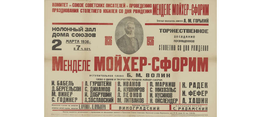 Сейчас это трудно осознавать, но еврейская театральная жизнь била ключом в СССР вплоть до ее почти полного уничтожения в конце 40-х. От созданного в 1919 году в Петрограде Еврейского камерного театра под руководством Грановского, которого позже сменил Михоэлс, до знаменитой «Габимы», игравшей спектакли на иврите. Возникали и идишские варьете, и эстрадные объединения. Театральных афиш среди еврейских плакатов времен СССР – множество. Но самый показательный посвящен вечеру в Колонном зале Дома Союзов в честь столетия идишского классика Менделе Мойхера Сфорима.