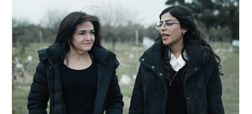 С этого, собственно, и начинается фильм – со съемки сожженных и разрушенных домов в кибуце Кфар-Аза: мы видим обугленные машины во дворах, перевернутые вверх дном комнаты, сгоревшие матрасы на кроватях и детские тапочки на черном полу. Невольно в памяти тут же всплывают груды обуви погибших в Освенциме – сколько бы ни говорили, что не стоит сравнивать резню 7 октября с Холокостом, такая ассоциация все равно возникает. Затем мы видим, как Шерил Зандберг смотрит в окно машины, везущей ее на съемки, и как кардинально в нем меняется пейзаж – с пасторального на чудовищный.